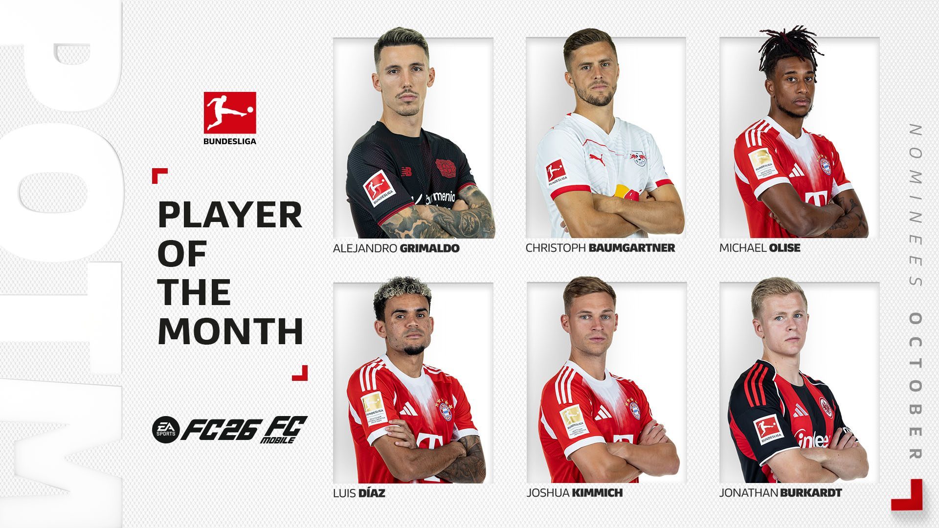6686体育11月7日讯 德甲官方公布了十月份联赛事最佳球员,法兰克福前锋伯克特力压拜仁前锋迪亚斯和药厂队长格里马尔多当选。