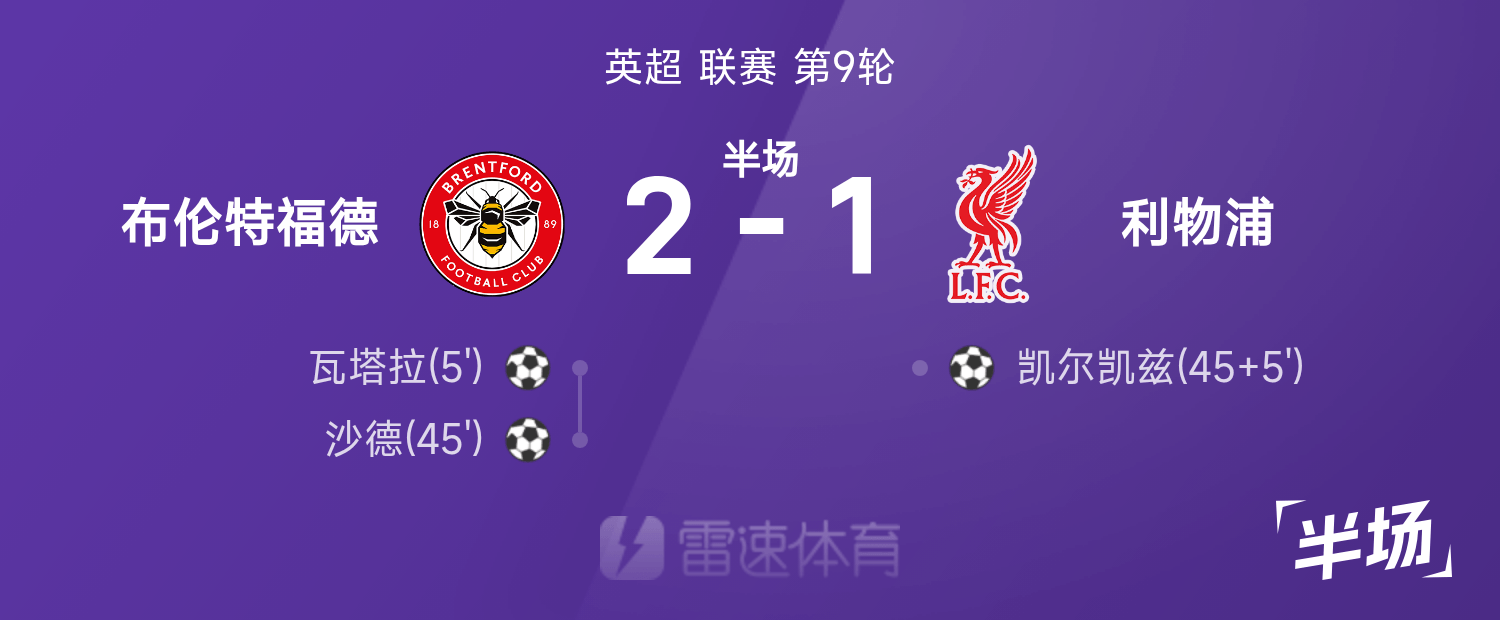 英超半场:瓦塔拉凌空侧钩破门,布伦特福德暂2-1利物浦