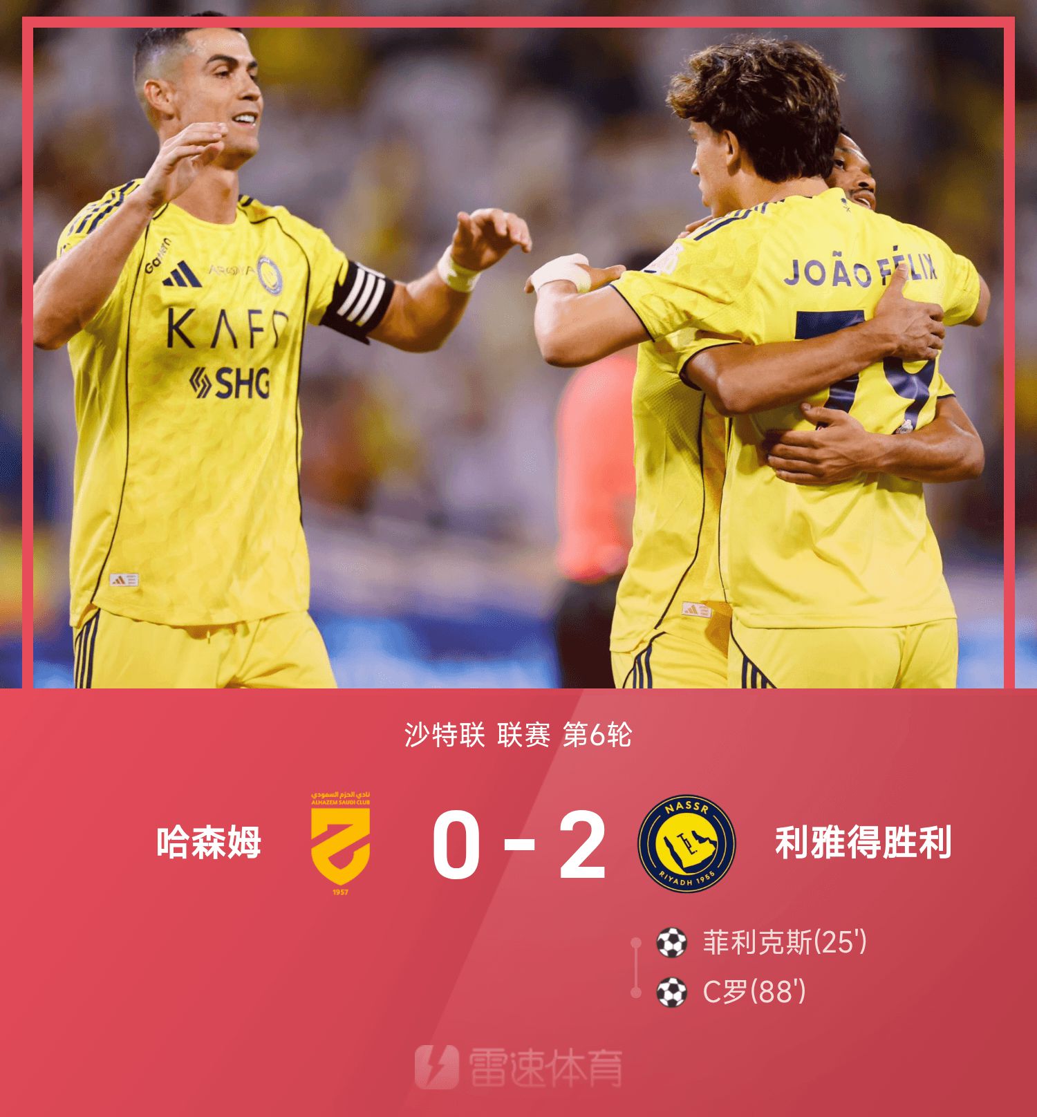 6686体育10月26日讯 25/26赛季沙特联联赛事第6轮,利雅得胜出局2-0战胜哈森姆。上半场菲利克斯顶球破僵,下半场终结前,C罗吊射锁定胜局。最终,利雅得胜出局客队场2-0战胜哈森姆,豪取联赛事6连胜。