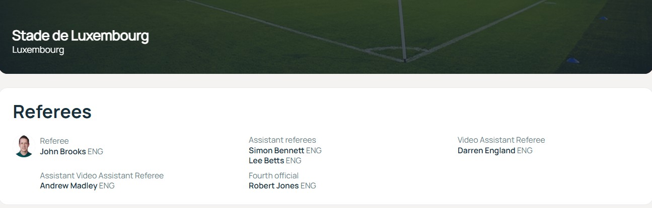 根据欧足联官方显示,本场竞赛将由来自英超的裁判员组执法,主裁判判是约翰·布鲁克斯,视频裁判由达伦·英格兰担任。