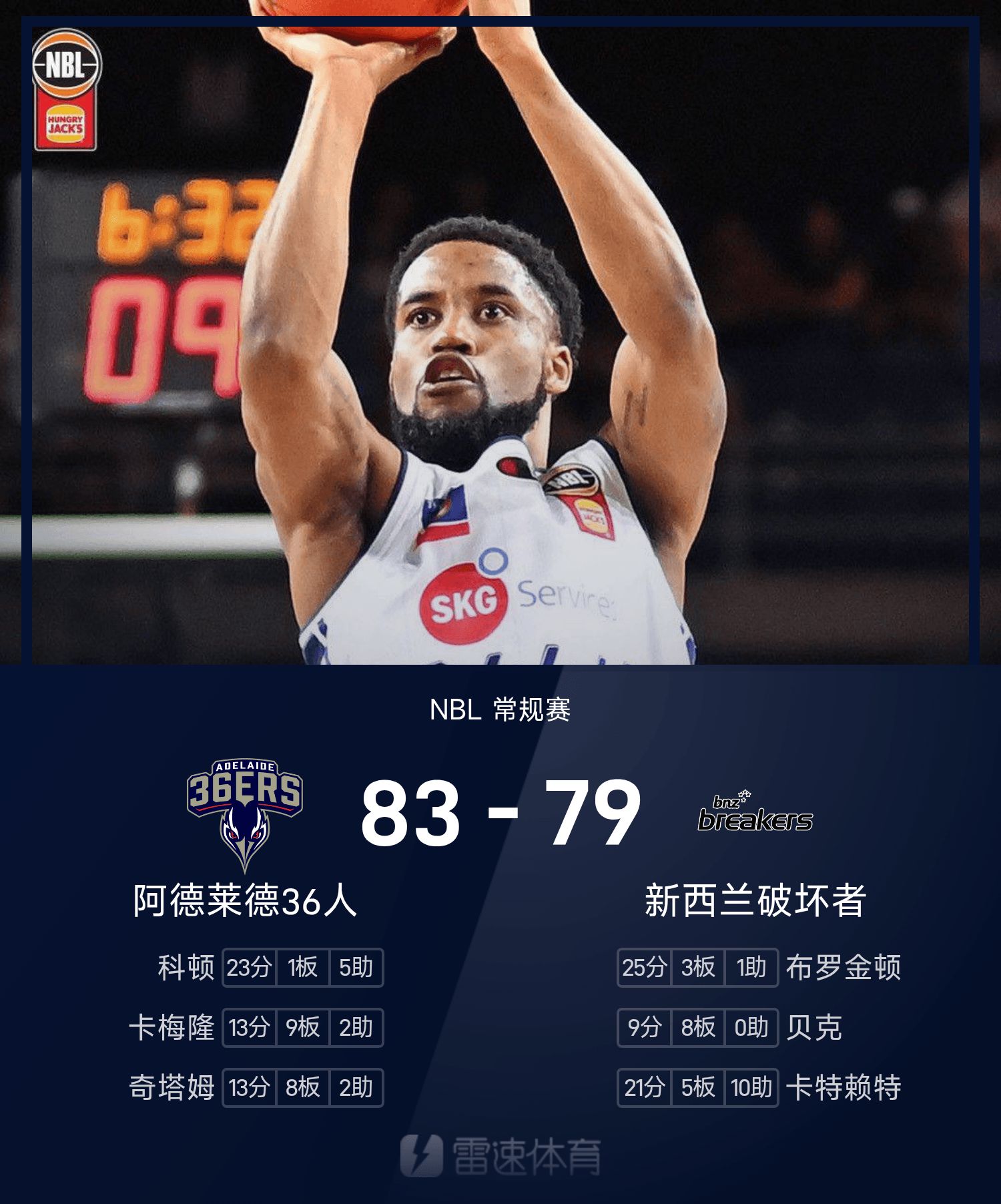 6686体育11月06日讯 25/26赛季NBL 常规赛,新西兰毁坏者对阵阿德莱德36人。双方全场战罢,新西兰毁坏者79-83不敌阿德莱德36人。科顿得到23分1板5助率队取胜,布罗金顿空砍全场最高的25分3板1助。