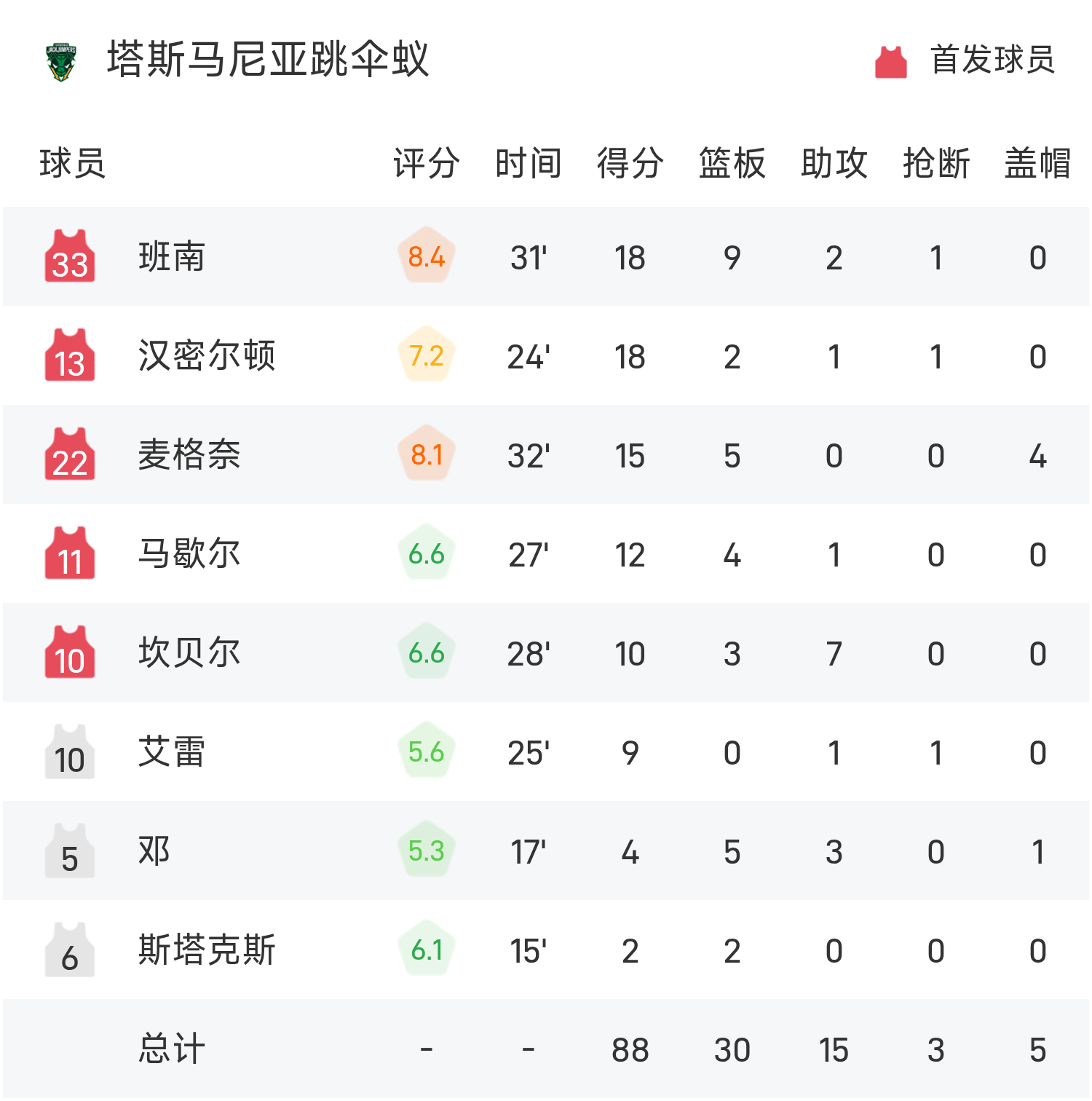 6686体育10月26日讯 25/26赛季NBL 常规赛,悉尼国王对阵塔斯马尼亚跳伞蚁。双方全场战罢,悉尼国王89-90不敌塔斯马尼亚跳伞蚁。班南得到18分9板2助率队取胜,戴维斯空砍全场最高的22分6板5助。