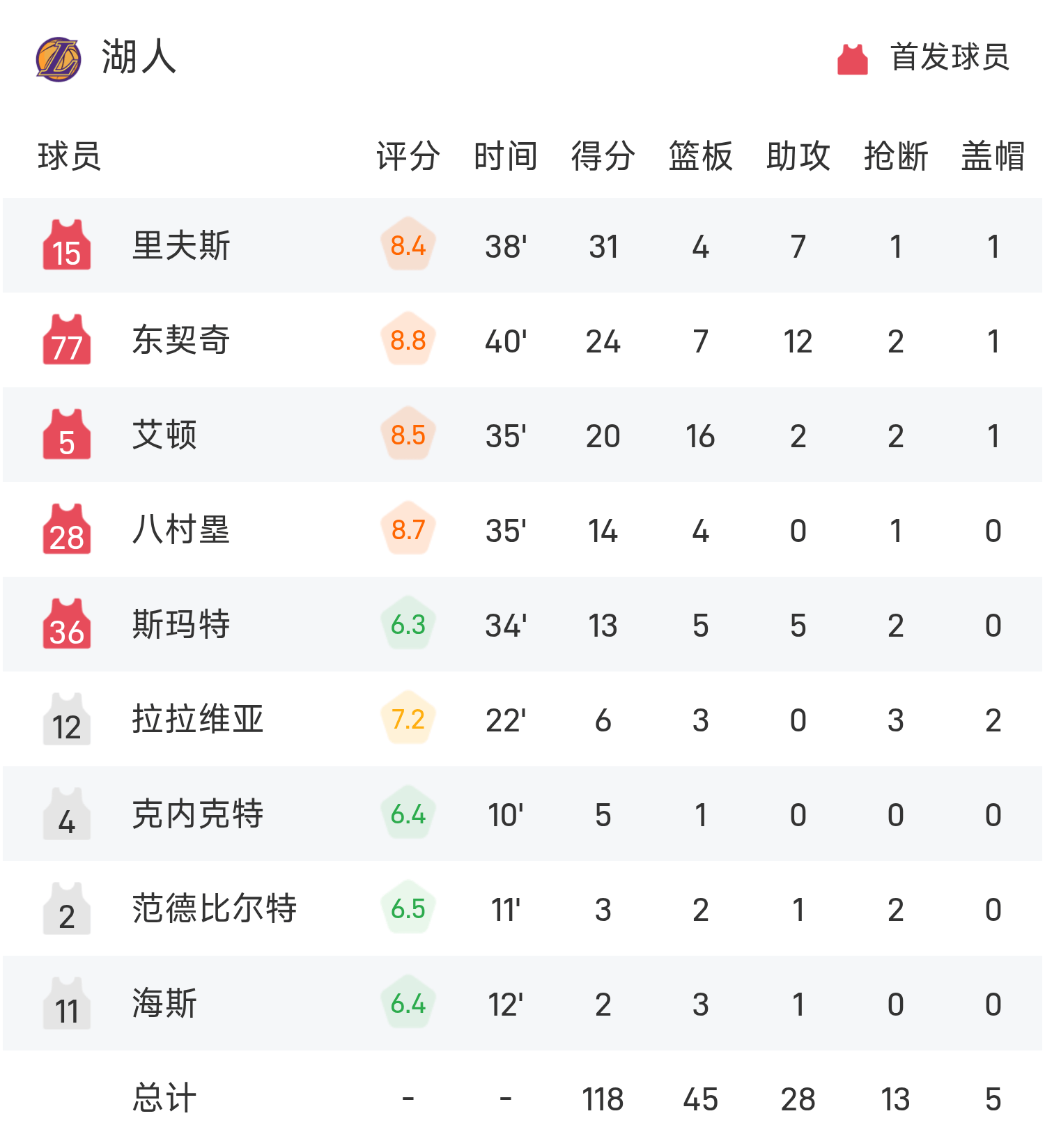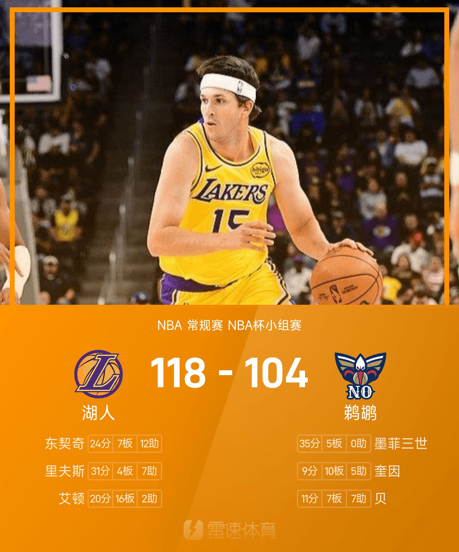 NBA杯战报:里夫斯31分7助,湖人118-104轻取鹈鹕