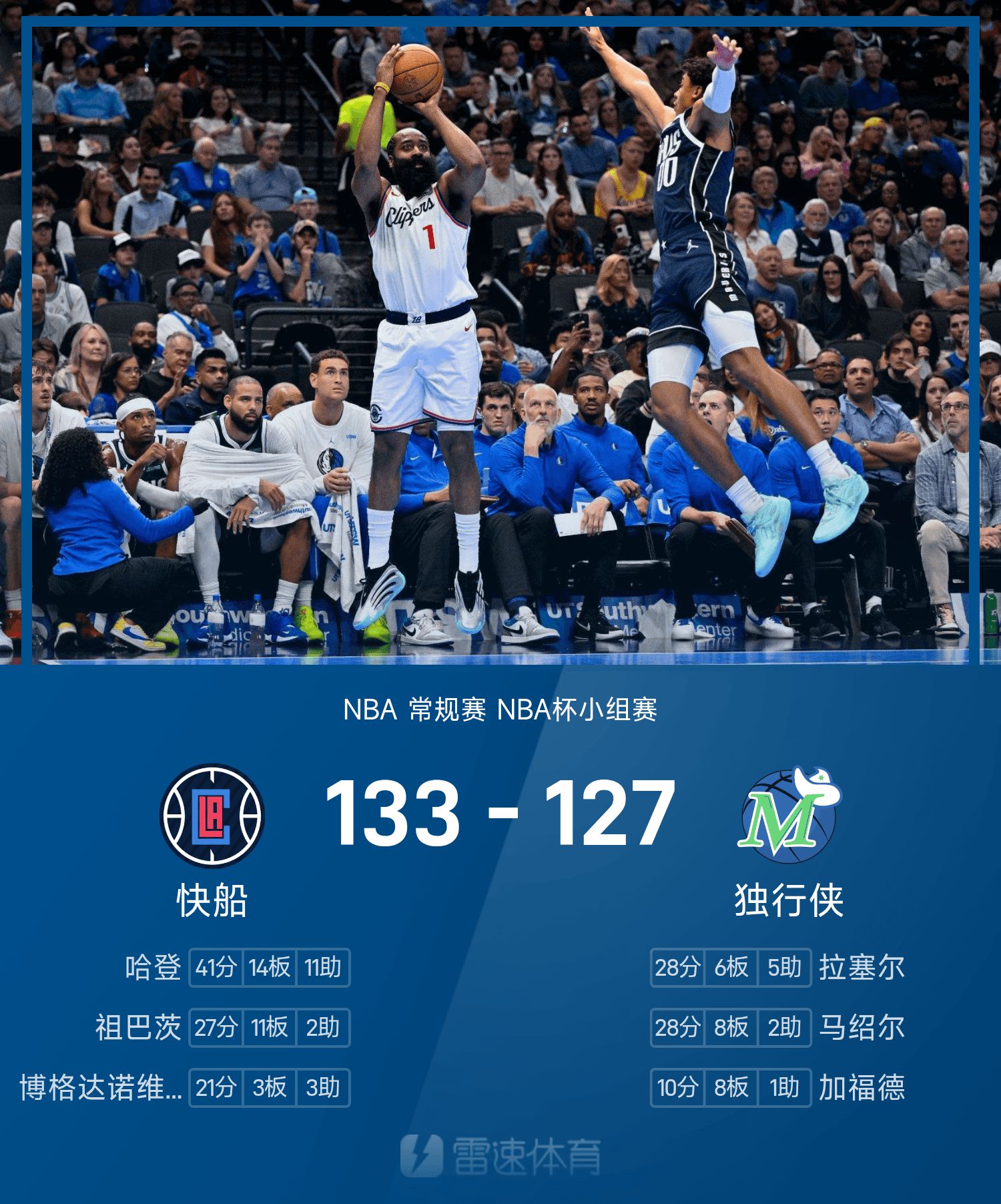 6686体育11月15日讯 25/26赛季NBA 常规赛 NBA杯分组赛,独行侠对阵快船。双方全场战罢,独行侠127-133不敌快船。哈登砍下全场最高的41分14板11助,率领快船胜利取胜。